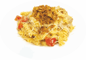 Makaroni, vistas kebaba gaļa, ķirštomāti, saldais krējums, siers, cietais siers, kaltēti sīpoli, sweet chilli mērce