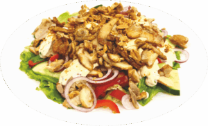 ledus salāts, tomāts, gurķis, marinēta paprika, sarkanais sīpols, vistas kebaba gaļa, majonēze, zemesrieksti, garšvielas